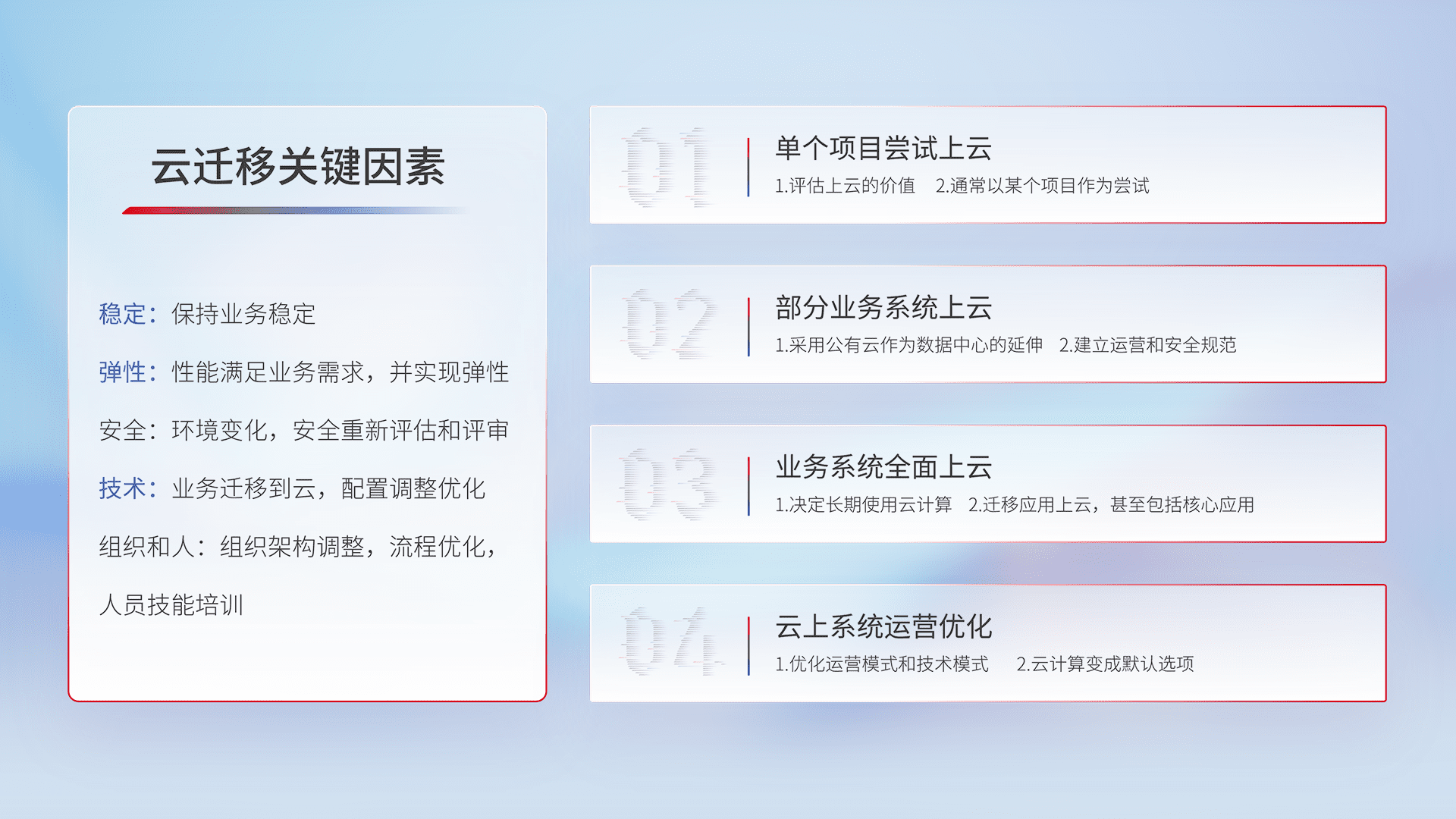 结合实际业务,,,,从规划设计、、、、云平台选型、、、云原生改造、、数据迁移、、、集成交付,,,,迁移全过程为客户识别最佳上云路径,,做好风险识别管理,,,,设计网络架构、、、、身份权限、、安全审计合规、、操作审计、、日志审计、、、、监控告警策略、、、多站点容灾设计等,,,对云上基础设施进行整体规划,,,提升IT治理水平,,,,以满足弹性、、、高可用、、、、高性能的需求。。。。