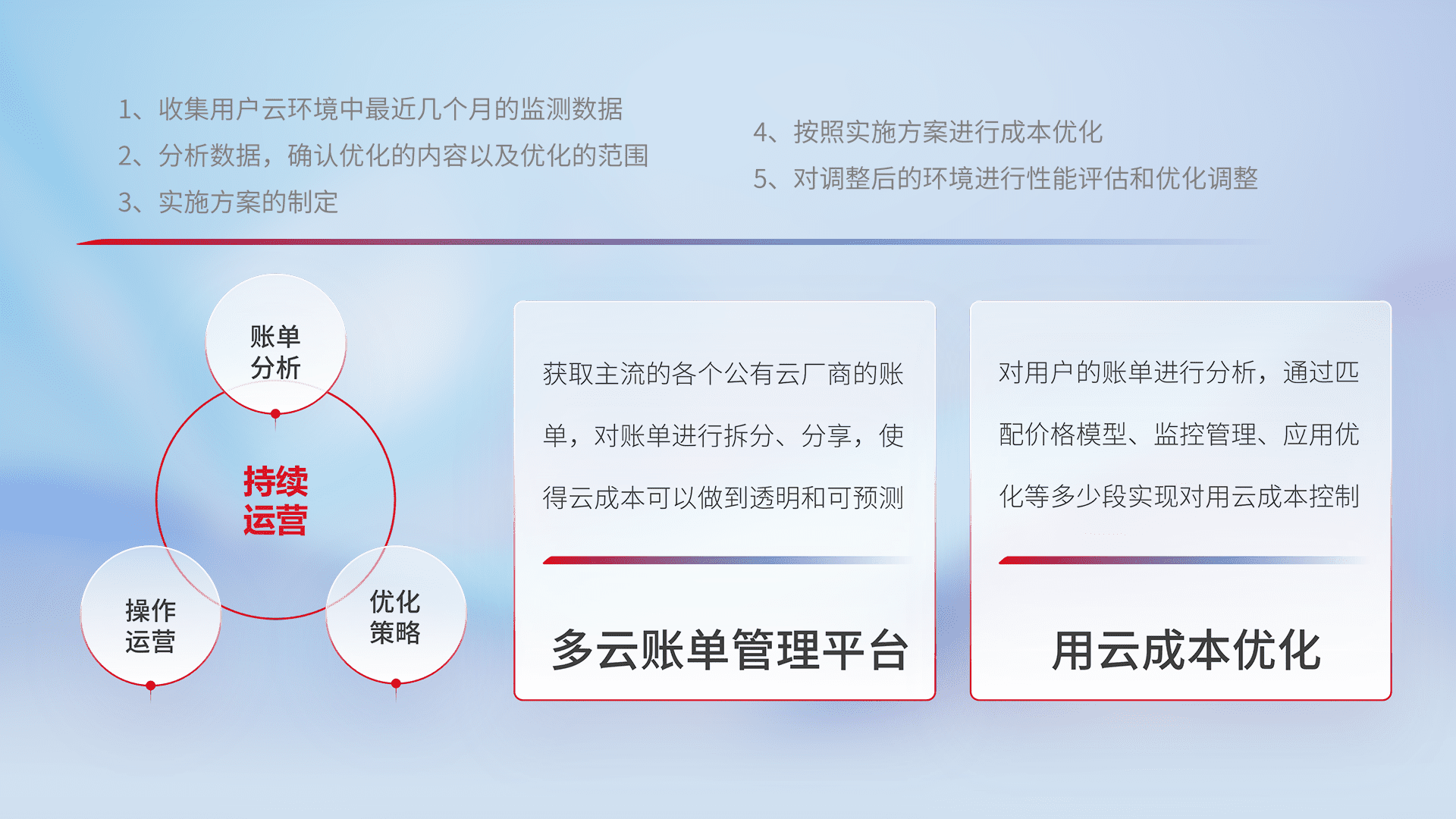通过多云纳管,,以统一的资源数据模型把客户的云资源进行抽象和封装,,,,进而实现对多云资源的统一操作,,,保障云资源管理的可靠性、、稳定性与可用性。。。。量身定制化运维内容,,配置、、开发运维、、、补丁管理、、、备份、、监控、、、、认证和访问管理、、、审计和日常巡检等,,,,保障在用云过程中的可靠度,,,稳定度以及高可用率。。
