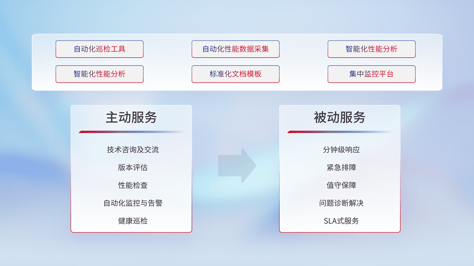 智能化工具和标准化文档,,,,保障服务质量,,提供主动服务(包含技术咨询、、、版本评估、、性能检查、、、、自动化监控与告警、、健康巡检)和被动服务包含(分钟级响应、、、紧急排障、、值守保障、、、问题诊断解决、、、、SLA服务)。。。