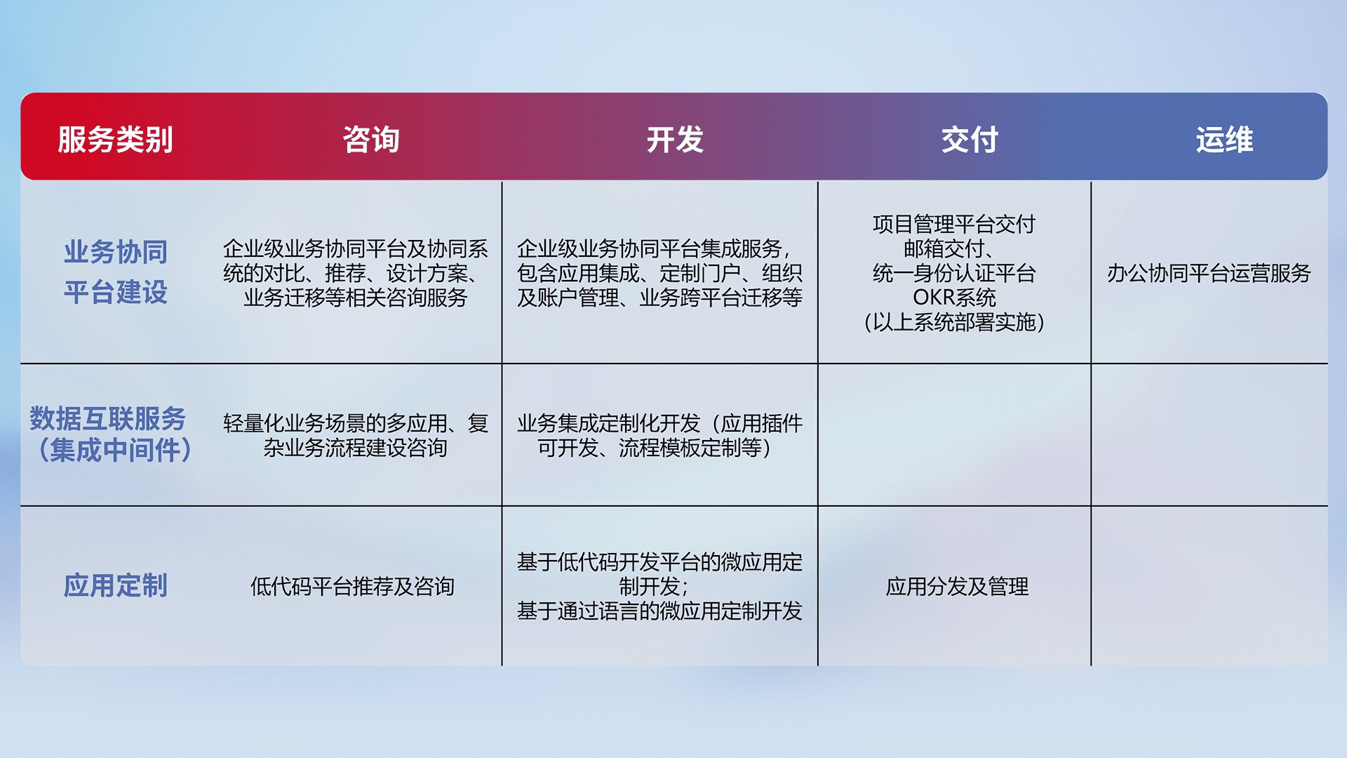 针对钉钉、、企微、、、IDaas等平台级产品提供产品的规划、、、、方案、、交付、、定制化开发等服务,,,,实现如统一协同办公、、智能客户服务、、混合会议管理、、、智能数据查询、、、等业务场景,,,,实现数字化转型。。。。